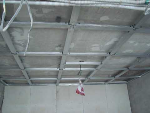 - Подшивной потолок — включает обшивку гипсокартоном каркаса из металла.