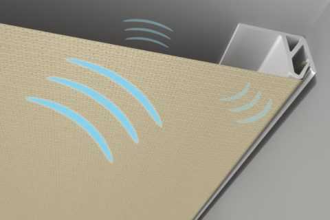 Сам по себе обеспечивает защиту от посторонних звуков только натяжной потолок из акустического полотна. Он изготовлен из высокопрочной пленки ПВХ, в которой сделана перфорация. Звуковые волны частично отражаются от полотна, а частично, проходя через перфорацию, меняют свою амплитуду и частоту и становятся неощутимыми.