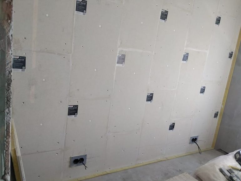 Гипсокартон крепится на специальный каркас. В ячейки каркаса укладывается звукоизоляционный материал.