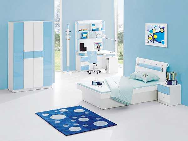 Можно попробовать другой вариант: синяя мебель на фоне светлых стен. Синий считается холодным оттенком, а потому, для уравновешивания хорошо бы добавить в комнату теплые тона: белый, молочный, персиковый, жемчужный или бежевый.