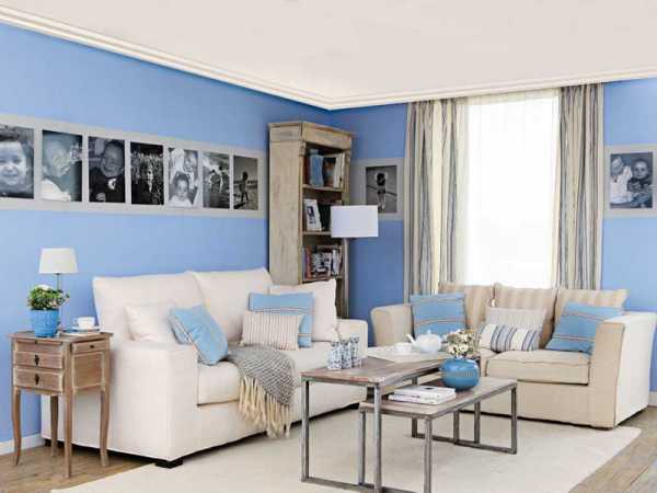 Светло-синие стены будут выглядеть праздничнее, если в гостиной будут предметы более насыщенного синего оттенка.
