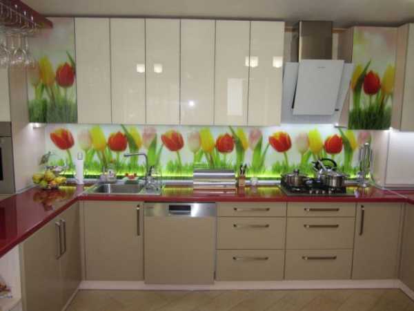 На фото — красная глянцевая кухня с морским мотивом скинали.Стеклянный фартук: преимущества и недостатки