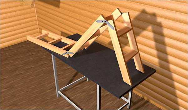 Сборка лестницыСамым простым вариантом складной конструкции станет устройство, состоящее из двух секций. Для его изготовления потребуются деревянные бруски, петли и металлические полосы для крепления, саморезы.