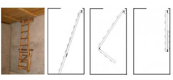 Если люк располагается возле края перекрытия, то для подъема можно установить своими руками откидную лестницу из двух секций, которая будет опираться на стену. Основой для конструкции может стать готовое изделие, на трансформацию его потребуется около двух часов.