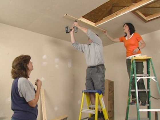 Монтаж чердачной лестницы должны проводить два человека — один работает на чердаке, а другой помогает снизу. Установка чердачной лестницы проводится следующим образом: убедитесь, что проем, в который она устанавливается, имеет подходящие размеры. Прикрепите бруски к нижней части проема, на которые будет опираться в дальнейшем вся конструкция. Поднимите ее на чердак и уложите на вспомогательные бруски. Установите распорки между проемом и лестничной коробкой, закрепите конструкцию шурупами (сзади и спереди), уберите вспомогательные бруски и разложите ее. Зафиксируйте готовую конструкцию также шурупами с боковой стороны. Щель между проемом и лестничной коробкой заполните монтажной пеной. Лестница на чердак готова, осталось отладить ее согласно прилагаемой инструкции.