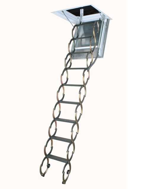 Чердачные складные лестницы состоят из нескольких секций, в основном из трех или четырех (возможно больше), которые накладываются друг на друга в процессе эксплуатации, тем самым превращаясь в достаточно удобную и компактную конструкцию. Складывающиеся лестницы можно регулировать по высоте, достигая необходимого размера. Одной из разновидностей таких конструкций являются так называемые лестницы «гармошки», которые изготавливаются исключительно из металла (стали или алюминия). На фото ниже вы можете увидеть пример такой конструкции.