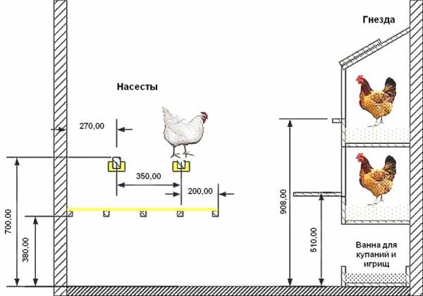 Схема обустройства курятника с оптимальными размерами для расположения насестов и гнезд