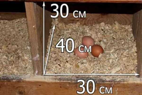 Размер гнезда для кур тоже определяется их породой. Обычно высота берется 300 мм иногда для больших кур до 450 мм. По площади основания размер принимается от 300-400 по ширине и 300-400 по длине.