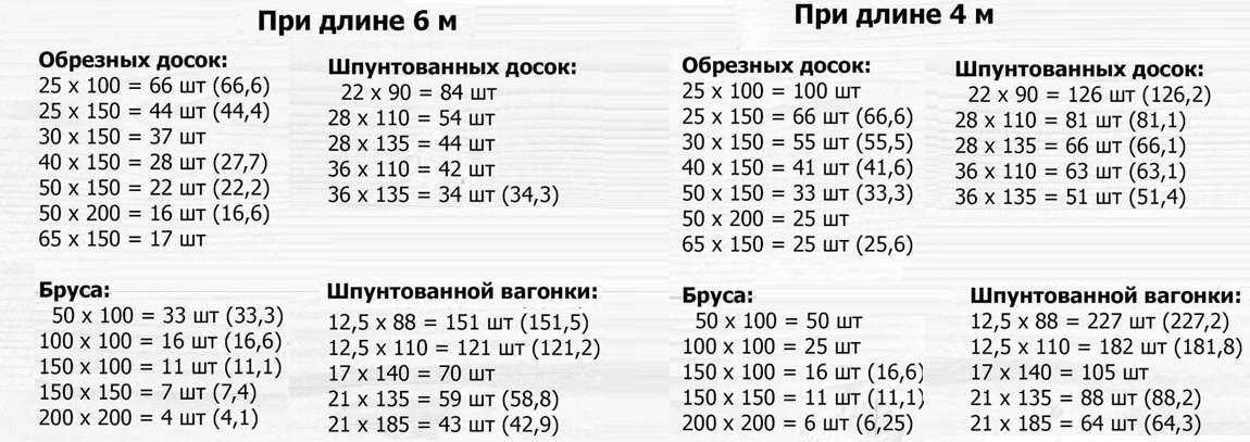 Таблица кубатурник пиломатериала, сколько штук бруса и доски в кубе
