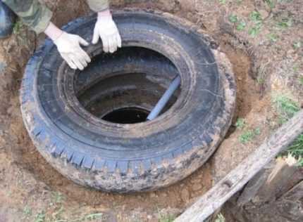 - Покрышки разместите таким способом, чтобы верхняя слегка возвышалась над поверхностью. Это предотвратит переполнение ямы при поступлении в нее талых вод.