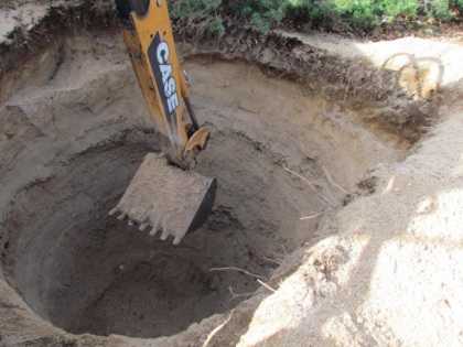 - Вырыв полностью котлован, берете бур и в середине ямы делаете отверстие для соединения с грунтовыми водами.