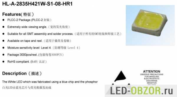 Приведу технические характеристики SMD 2835 datasheet с хорошими световым потоком от бренда Honglitronic.