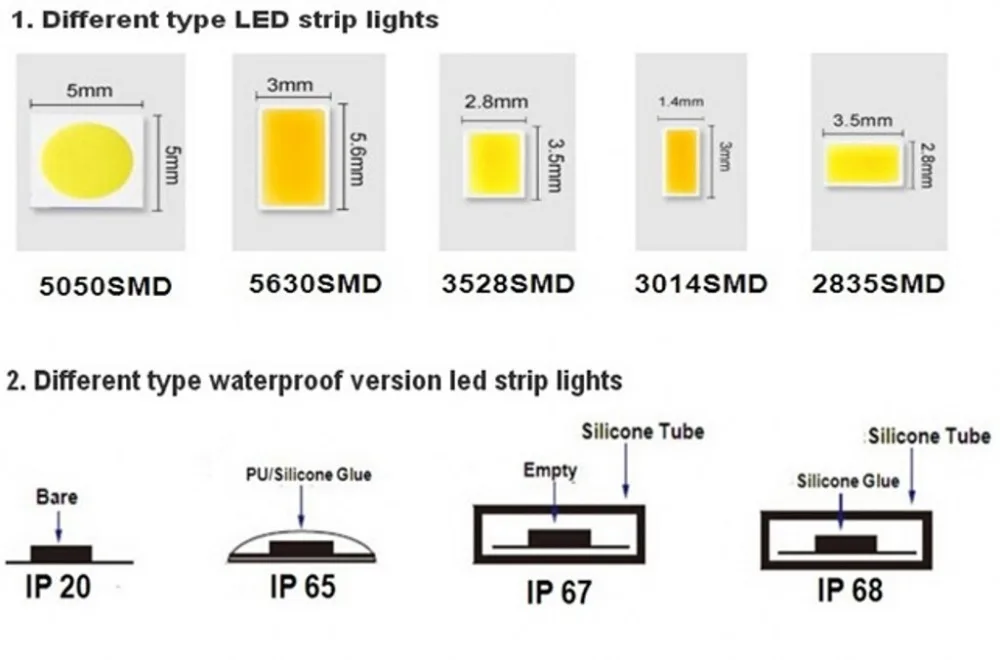 Разные числа соответствуют разным физическим размерам чипа. Числа 5050, 3528, 2835 и т. д. соответствуют размеру микросхемы в миллиметрах. Некоторые светодиоды ярче других, а некоторые излучают больше света на ватт.