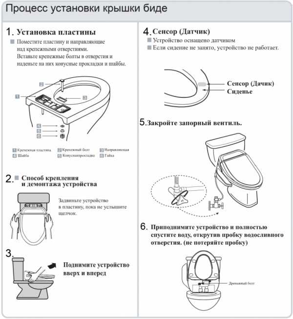 Такой комплект ставится на унитаз. Он не нуждается в дополнительном месте, а потому установка не требует дальнейшего косметического ремонта. Но для монтажа крышки-биде нужно соблюдение определенных правил: