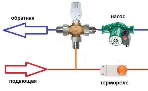 Для выполнения основной функции к крану подводится горячая вода от котла и холодная из обратки. Внутри устройства оба потока смешиваются, и на выходе получается нужная температура. Поэтому часто применяется термин «смесительный клапан». Регулировка температуры на выходе производится вращением ручки на кране или в автоматическом режиме с использованием термодатчика.