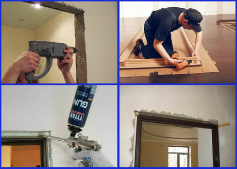 - Готовая основа устанавливается в дверной проем. Зафиксировать можно при помощи клиньев.