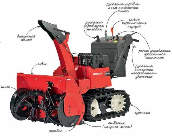 - двигатель – основной узел снегоуборщика, который приводит в действие рабочие органы агрегата. Если снегоочиститель самоходный, то мотор также отвечает за движение колес или гусениц техники;