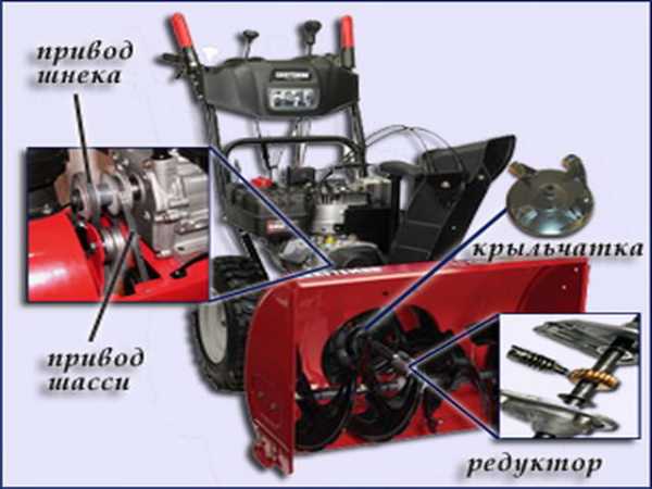 Момент вращения от мотора передается к рабочей системе при помощи вала отбора мощности и клиноременной передачи, которые напрямую соединены с ротором. Шнек подключается через редуктор, его обороты довольно высокие. Отличают необслуживаемые и обслуживаемые редукторы с материалом корпуса из алюминиевых сплавов. В профессиональных машинах применяется чугун: