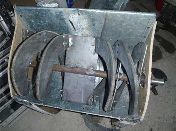В двухступенчатых снегоуборщиках в конструкции шнека можно использовать не пластину, а усовершенствованный ротор. Он имеет форму четырех скрепленных прямоугольных пластин с осью посередине. Желательно, чтобы пластины имели ободки по краям, для того, чтобы лучше «забирать» снег.