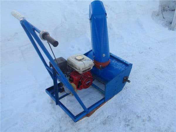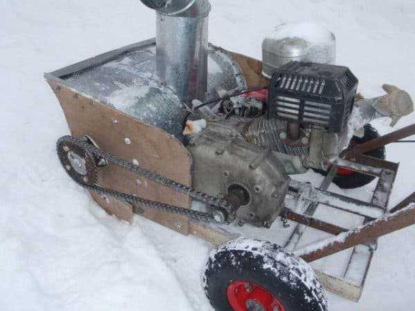 Самодельный снегоприемник крепят к раме. Бензиновый мотор устанавливают на регулирующиеся полозья. Ремнем соединяют шкивы ротора и двигателя. Для передвижения самодельную машину ставят на резиновые колеса.