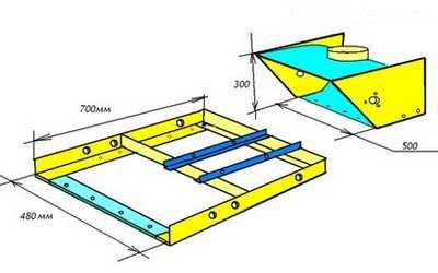 Самому сделать ковш, который будет служить корпусом для установки шнека, также несложно. Для этой цели обычно используют кровельное железо. На чертеже, приведенном ниже, указаны размеры ковша.