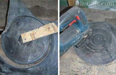 - Корпус улитки вырезают из нержавеющей бочки для пива. Болгаркой отрезают фрагмент со стороны днища шириной 150 мм. Нарисовав две пересекающиеся линии крестом, на дне определяют центр окружности. В точке пересечения просверливают отверстие под вал редуктора триммера.