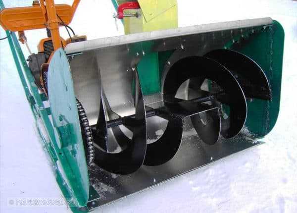 - Шнекороторная самодельная навеска является комбинированным устройством. Для мотоблока – это самый производительный механизм. Улитка ротора закреплена к тыльной стороне ковша шнекового снегоприемника. Сначала винтовой нож перемалывает снег. Рыхлая масса поступает в улитку, где ротор перемешивает ее с воздухом и выбрасывает через отводящий рукав.