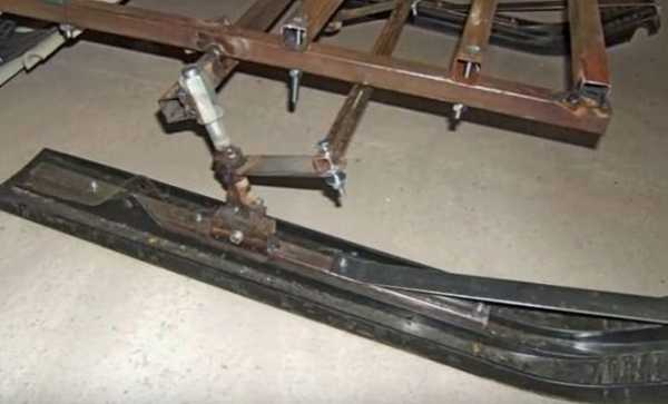 В передней подвеске лыжи применены с детского снегохода «Аргамак», усиленные трубой 25х25х2. Шарниры выполнены с помощью резьбового соединения М16. Аналогично исполнено рулевое управление. Руль использован от «Минска».