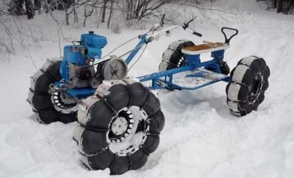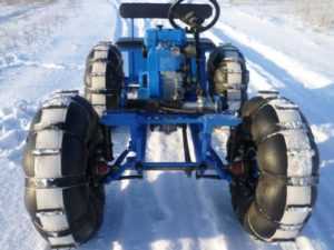 При установке колес для данного снегохода подбираются шины низкого давления или камеры от больших автомобилей. Их надевают на стандартные диски и закрепляют цепями. Двигатель мотоблока потребляет мало горючего, поэтому высокая автономность снегохода собственного производства позволит передвигаться на длинные расстояния.