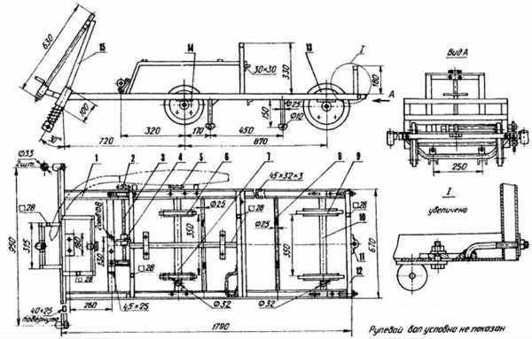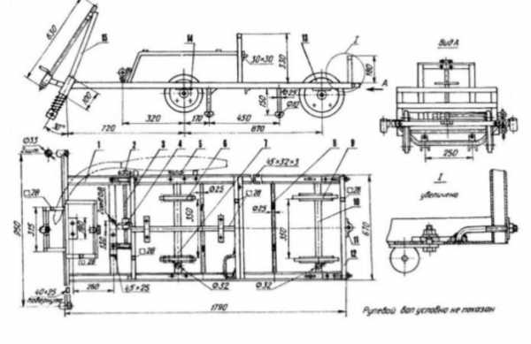 Двухколесный одноосный мотоблок можно сделать 4-колесным и 2-осным при помощи небольшого прицепа. Его нужно намертво приварить к раме мотоблока.