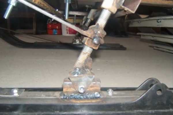 4. В качестве полозьев используем две лыжи, соединенных шарнирами с рулевой колонкой. В качестве поворотных втулок используем болты. При постоянной смазке они прослужат очень долго. Кроме этого за счет положения патрубков можно изменять клиренс снегохода. Для снятия нагрузки с гусеницы устанавливают опорную лыжу с натяжными роликами.