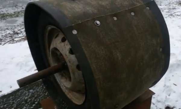 10. Изготовьте четыре стальных обруча по диаметру немного меньше, чем накаченная камера соответственно всех колес снегохода. По ширине они должны быть в 2-3 раза больше, чем соответствующее колесо. Далее с наружной стороны приварите по 7-8 пластин толщиной 20 мм для лучшего сцепления с полотном дороги. После чего камеры спустите, установите обручи и снова накачайте. Получится недорогой, но довольно приемлемый вариант колеса для снежной дороги.