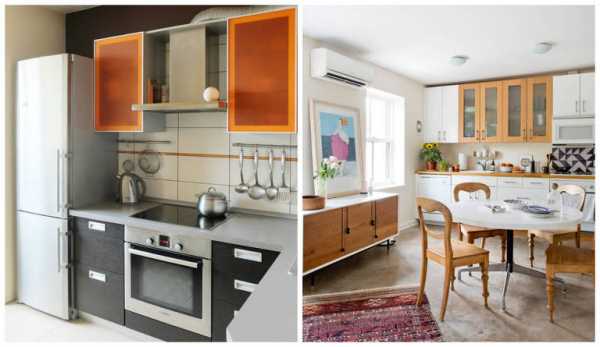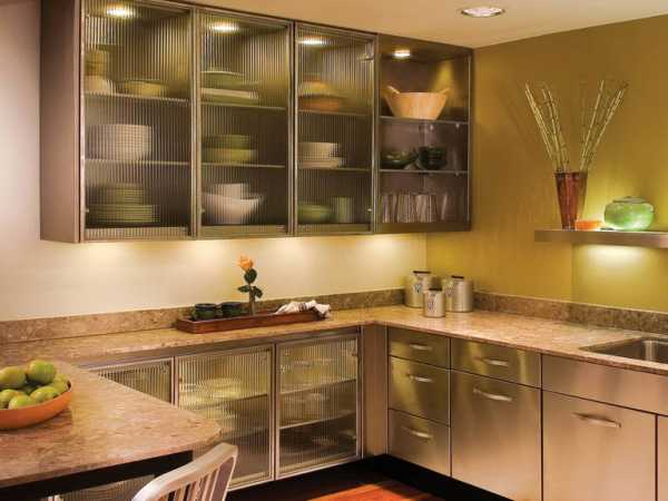 Если кухонное помещение небольшое, часто возникают трудности с подбором мебели. Правильно оформленные стеклянные фасады помогут визуально увеличить комнату, сделать ее просторнее.