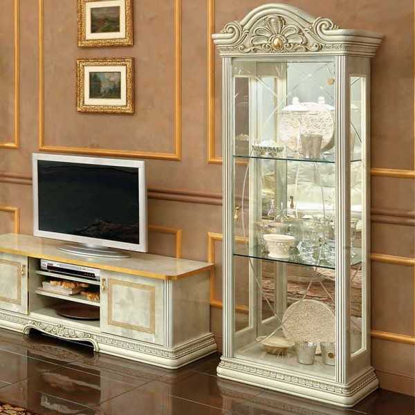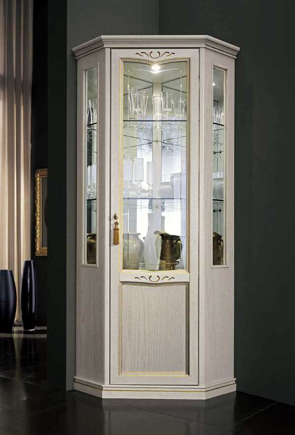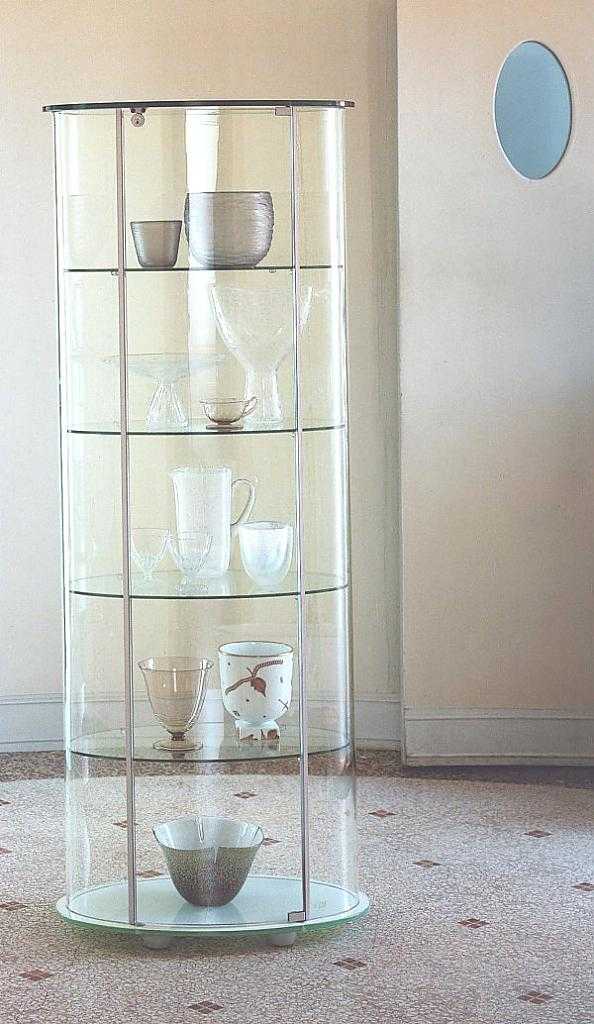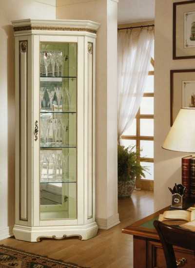 - оригинальный и элегантный вид – шкаф витрина. Этот предмет мебели представляет собой цельную систему хранения, остекленную со всех сторон и не поделенную на верхнюю и нижнюю части. Современная витрина изготавливается из сплошного стекла, включая полки, которые часто подсвечивают светодиодной лентой. Его применяют как элемент декора, выставляя на полочки коллекции сервизов, хрустальных ваз;