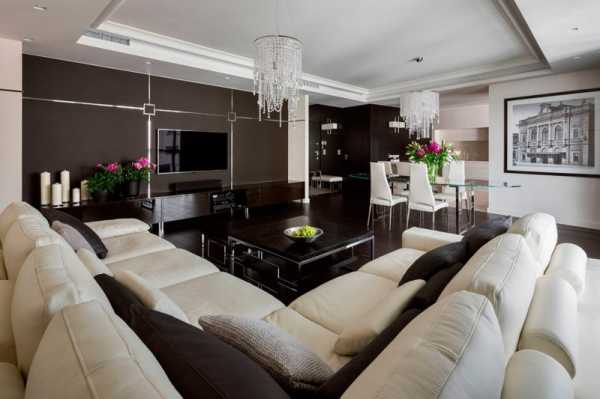 Если помещение большое (более 14 м.кв.) и светлое, можно дать черному цвету «разгуляться». Его можно выразить в обоях, крупной мебели и даже напольном покрытии. Чтобы гамма еще больше олицетворяла элегантность, дополните обстановку хрустальными изделиями, кожей и глянцем. Черно-белый интерьер гостиной удачно дополнит красный, коричневый, фиолетовый.