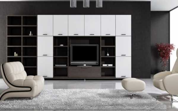 Современная комната в белом стиле, центр которой — миниатюрная стенка или телевизионная тумба, будет смотреться очень выигрышно.