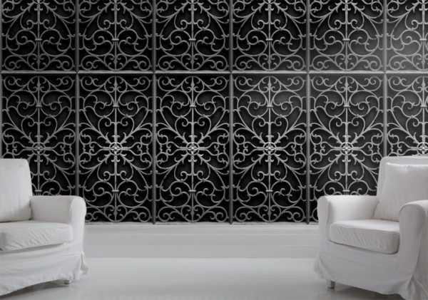 - Классика – черные растительные узоры, виньетки, цветы и медальоны на белом фоне сделают зал утонченным и даже аристократичным.