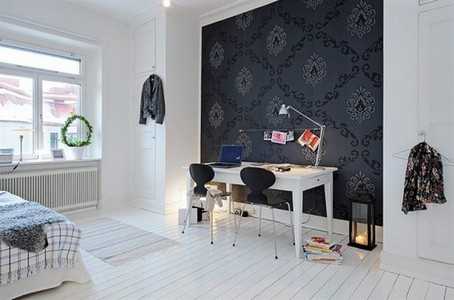 В современных интерьерах, особенно в минималистичных, черные обои обычно комбинируют с другими. Как правило, создается акцентная стена черного цвета. Чаще всего акцентируют стены за диваном в гостиной, за кроватью в спальне, возле туалетного столика в спальне или прихожей, а также ТВ-зону и стену, к которой приставлен компьютерный стол (это позволяет выделить кабинетную зону). Оклеить обоями можно всю стену или только ее часть.