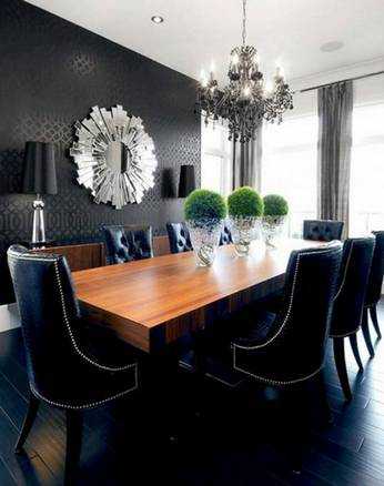Черные обои, особенно с серебристыми и реже золотистыми орнаментами (или с черными рисунками на серебристом и золотистом фоне), используются для создания таинственно-роскошной атмосферы в интерьерах в стилях необарокко и гламур.