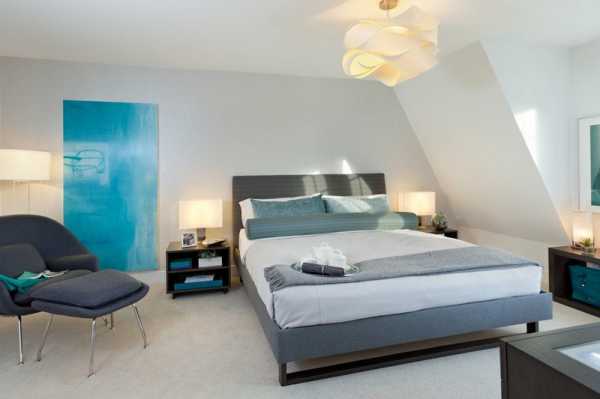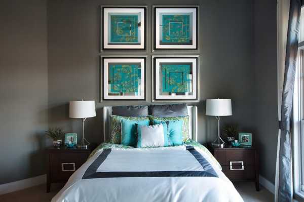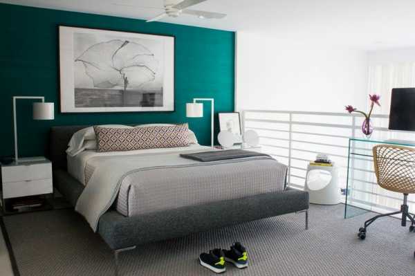 Современный интерьер — сочетание серого и бирюзового в спальне