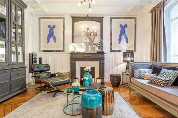 Оттенки голубого на стенах и темно-серый камин