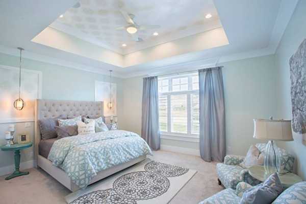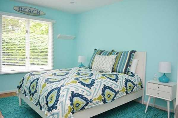 При подборе оттеночной гаммы для спальни предпочтение стоит отдавать более спокойным тональностям. Отличным вариантом станет белый с бирюзовым в интерьере этой комнаты.
