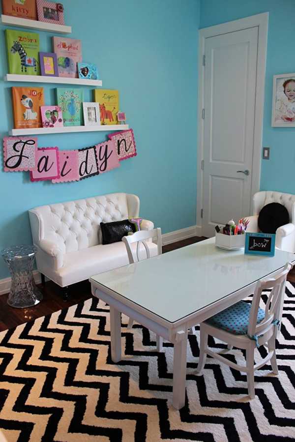 Бирюза – универсальный цвет, он подойдет для девочек и мальчиков. Маленькой принцессе понравится сочетание с сиреневым цветом, юному джентльмену – комбинация с зеленым. Для любой комнаты подойдет дуэт с одним из таких цветов: