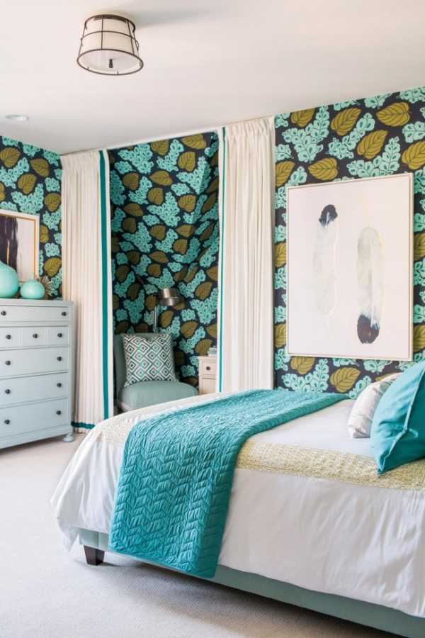 Спальню можно сделать «отделением» морского курорта: для этого нужно всего лишь добавить несколько бирюзовых акцентов или использовать светлые обои цвета морской волны. Покрытие стен может быть однотонным или с ненавязчивым орнаментом. Узор бывает серо-зеленым, желтым, светло-оранжевым, темно-синим – по желанию.