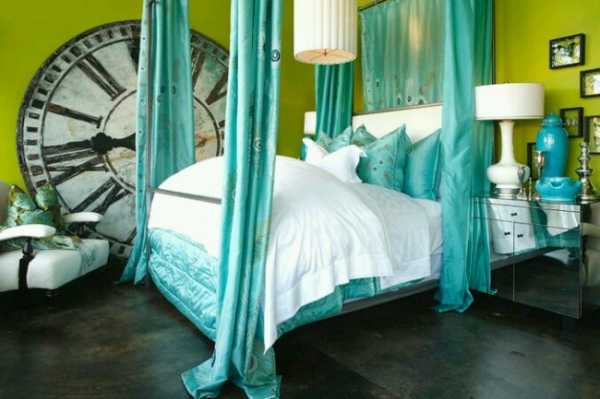 Если же ее дизайн предполагает подчеркивание богатства оформления, то роскошно будет смотреться сочетание бирюзового цвета в интерьере спальни с золотыми элементами отделки или обстановки.