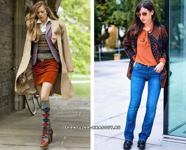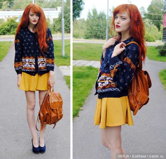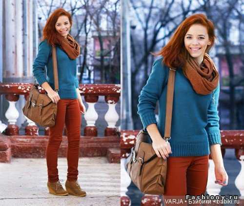 Под медную мини юбку (прямую, трапецию, облегающую) подойдет вязанная жилетка и чулки с ретро орнаментом. А вот пшеничные волосы будут выигрышно смотреться на фоне нюдового пальто. К светлым джинсам брюнетка смело наденет морковную блузку с бантом. Вдобавок кардиган с этническим узором придаст образу легкости.