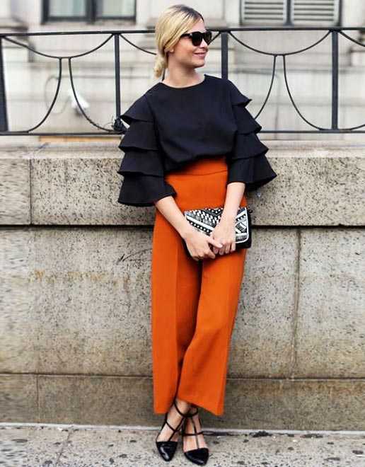 тандем рыжего с голубым- Черная классика. Если выбор пал на облегающую юбку миди в таком тоне, то к ней нужно найти кофточку с кроем «летучая мышь». Образ будет играть совсем по-новому с массивными янтарными аксессуарами и замшевыми туфлями на высоком каблуке. А вот к пальто с широкими лацканами стоит взять темно-синие джинсы и тунику в греческом стиле. Комплекты в стиле кэжуал (как на фото) в простом, лаконичном соединении выглядит выразительно, подойдет на каждый день.