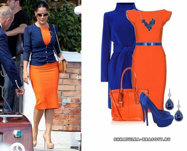 К оранжевому платью подойдет приталенная сапфировая кофта (кардиган). Перламутровые пуговицы гармонируют с кремовыми туфлями «Даффодил». При этом коричневая сумка-кроссбоди изысканно сидит на ее плече. Однако не нужно быть звездой, чтобы выглядеть шикарно. Свой образ поможет создать: