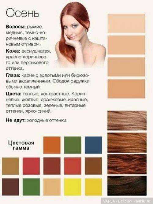 Как утверждают специалисты по колористике, женщины с рыжими волосами по умолчанию относятся к «осеннему» цветотипу. Это накладывает определённый отпечаток на возможность выбора цветовой гаммы для гардероба. Среди рыжих красавиц выделяют холодный и тёплый тип, но это скорее касается оттенка кожи и цвета глаз. И то, и другое сегодня поправимо: с помощью макияжа либо контактных линз.