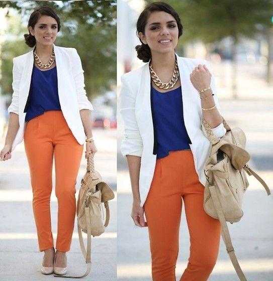 Такие талантливые актрисы, как Ева Лонгория и Гвинет Пэлтроу, давно оценили преимущества сочетания этих оттенков. Благодаря таким лукам они выглядят роскошно. Почему бы девушкам не подобрать к белоснежным скинни шифоновую блузку с оранжевым переливом. Бежевые босоножки, а также серебристая сумочка-клатч сделают из простой леди светскую львицу.